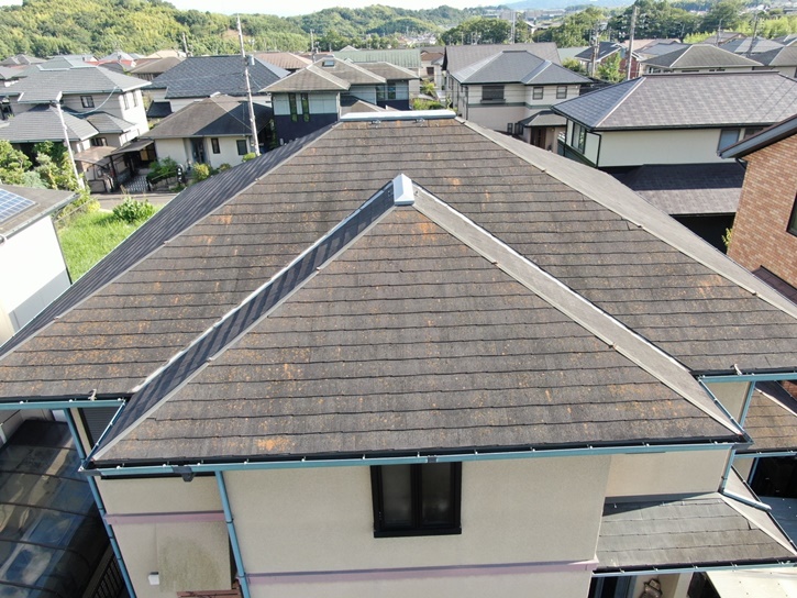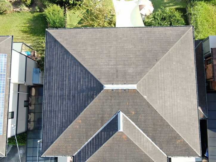 施工前のお写真です。 ドローンを使用することで下からでは見えなかった屋根上部まで劣化や汚れを確認することができます。